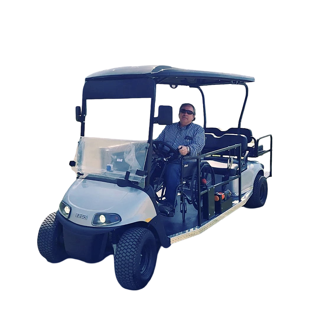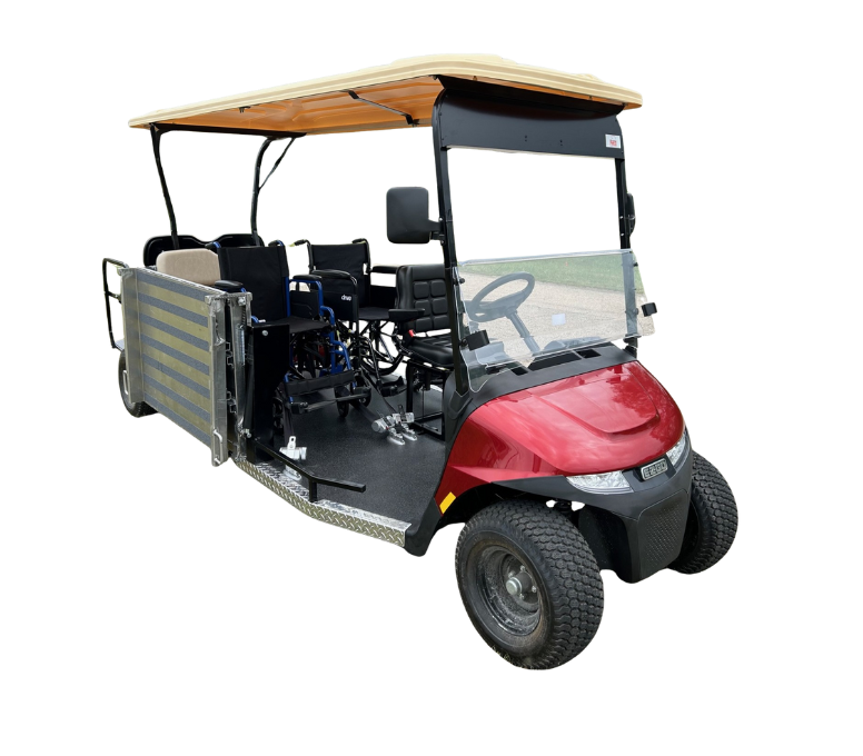 Built exclusively on EZGO Gas and Electric platforms, the DROP DECK RIDEABOUT features PHED Mobility’s signature drop deck mechanism, allowing the rear platform to lower flush to the ground for the easiest possible wheelchair entry.